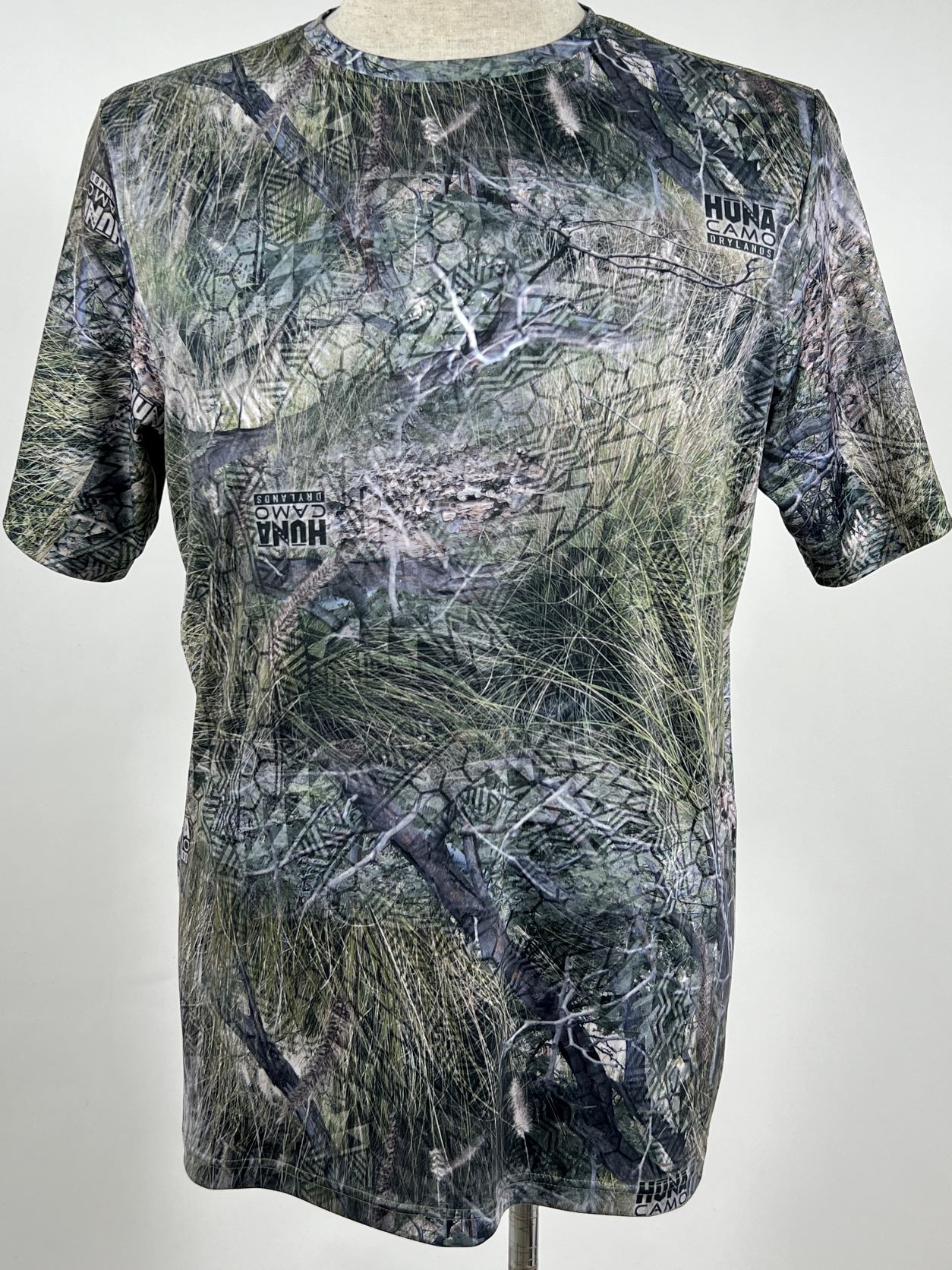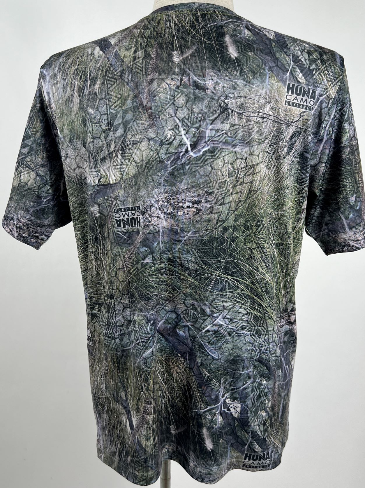 Featuring our proprietary Huna Camo Drylands camouflage pattern. Made of lightweight 150gsm high-wicking and breathable polyester fabric with a soft cotton feel. Designed with a relaxed contour to keep you cool and comfortable. We recommend purchasing a size down from usual size for best fit.