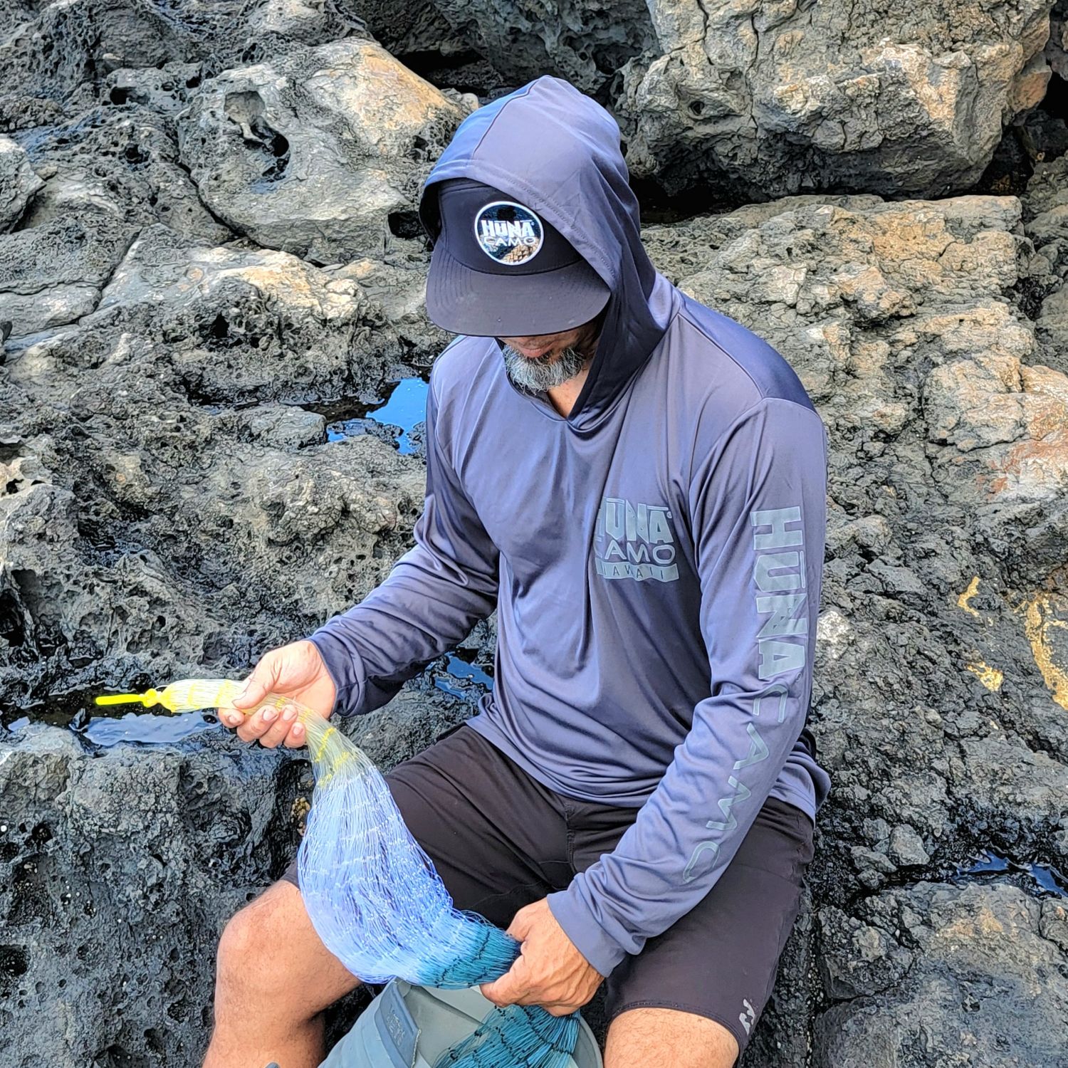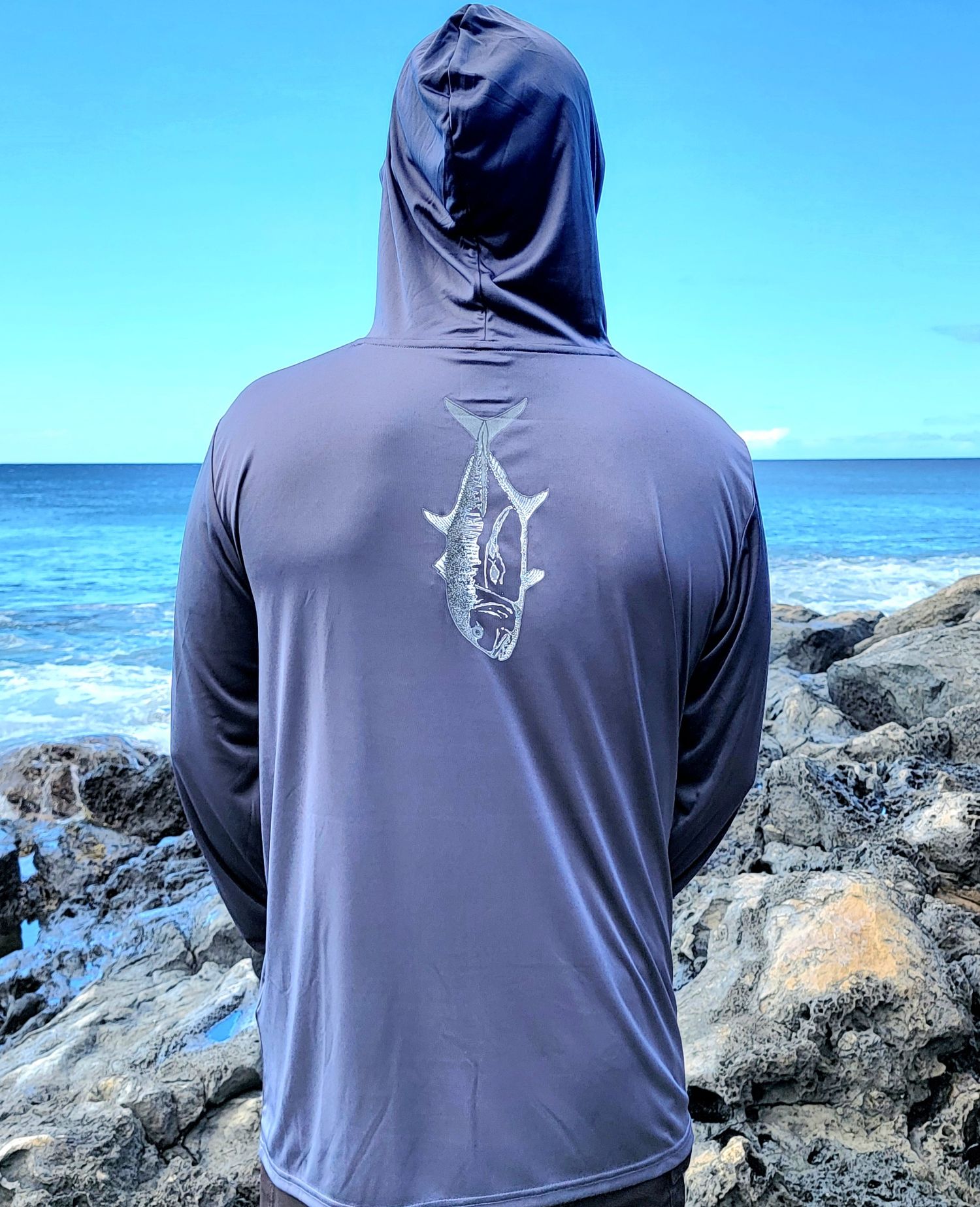 Graphite Hooded Long Sleeved shirt. Lightweight, 50 UPF polyester material to keep you cool and protected while fishing or just enjoying the outdoors. Gray Huna Camo logo on left chest and sleeve. Designed and made in Hawaii, utilizing eco-friendly ink technology. True to size.