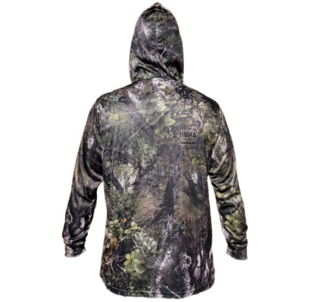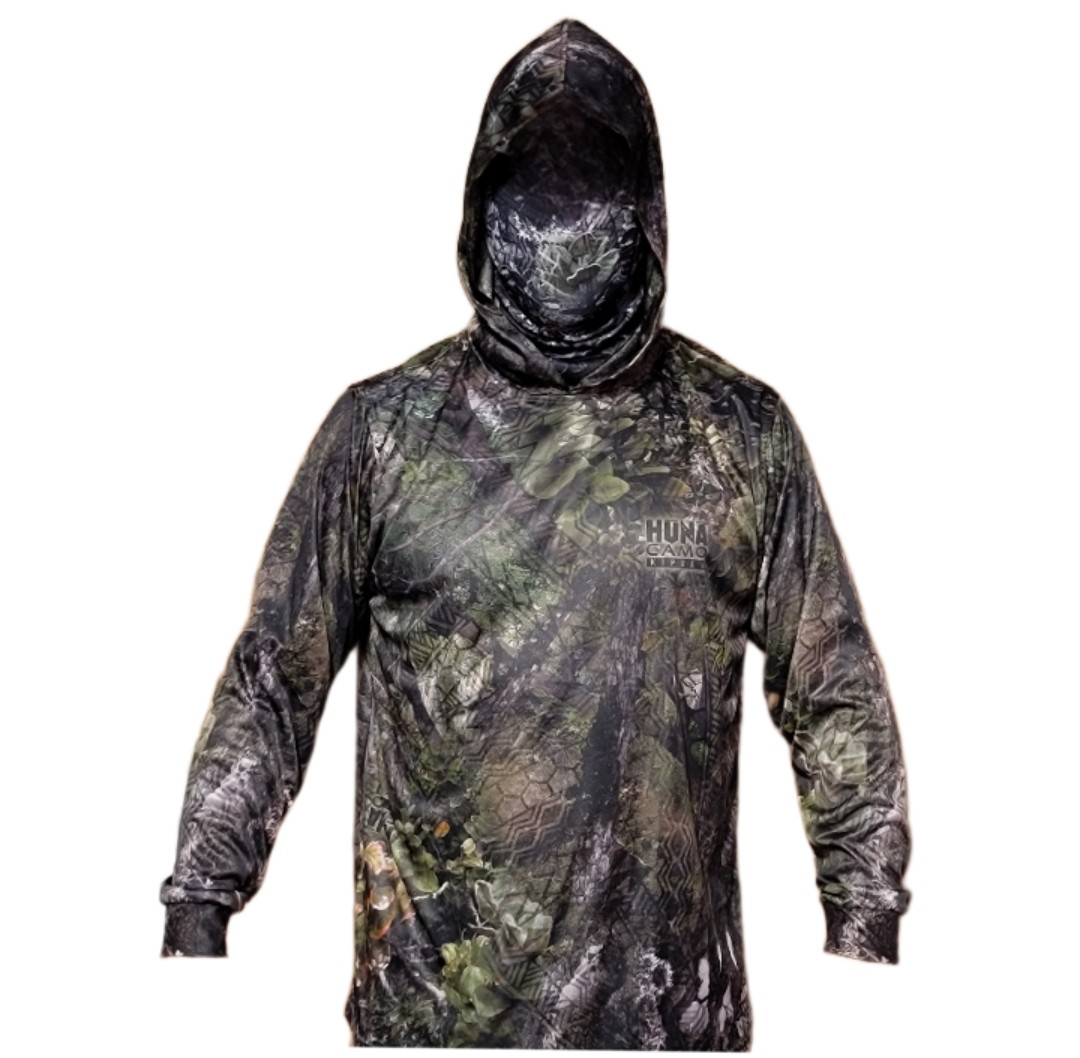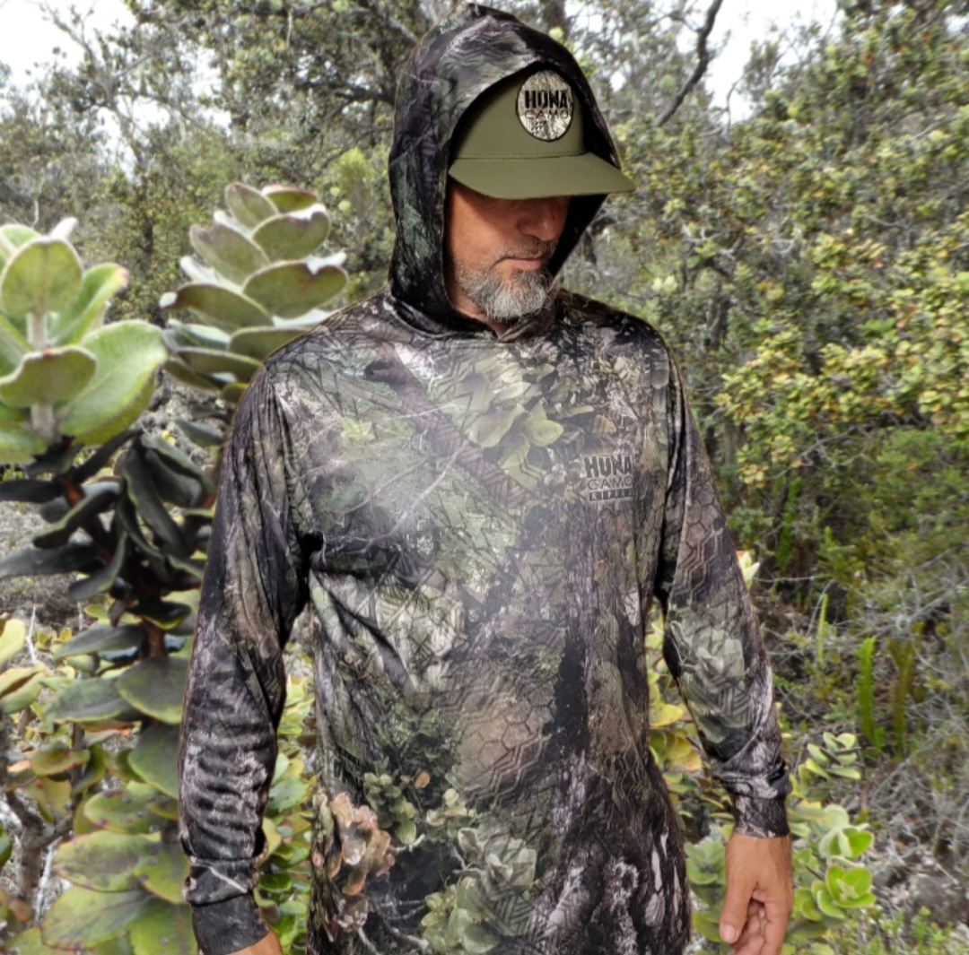Kipuka Hoodie. Lightweight, 50 UPF material to keep you cool, protected and comfortable while hunting or just enjoying the outdoors. Featuring our proprietary Huna Camo Kipuka Pattern. Designed in Hawaii. True to size. **Neck gaiter depicted in images sold separately**